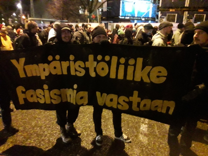 Fasistit kiihdyttävät ympäristön tuhoa sekä ilmastonmuutosta, joten on selvää, että ympäristöliikkeen tulee vastustaa heitä. Äärioikeiston ajatusmaailma ja ympäristönsuojelu eivät ole yhteensovitettavissa. Alistaminen, väkivalta ja eriarvoisuus, joita äärioikeisto ajaa, ulottuvat ihmisistä luontoon. Ne ryhmät, joita vastaan fasistit hyökkäävät, joutuvat myös kokemaan suurimman kärsimyksen ympäristökriisin edetessä. Ajamamme muutoksen tulee purkaa vallan keskittymistä ja väkivaltaisia rakenteita sekä taata kaikille elinkelpoinen planeetta nyt ja tulevaisuudessa. Vain me yhdessä voimme pysäyttää tuhoisan kehityksen.