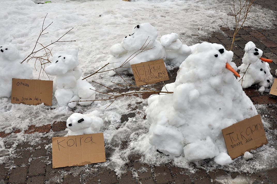 Voisi ajatella, että ilmastonmuutoksen vakavuudesta olisi jo riittämiin tietoa. Tilaisuus olikin enemmän näkyvä muistutus aiheesta ja moni ohikulkeva aikuinen kiinnostuikin keskustelemaan tilanteesta. Puhdas lumi veistoksia varten saatiin kaupungin toimesta tekojääradalta. Viime vuonna tapahtuma jouduttiin perumaan, koska tekojääradan luntakaan ei ollut saatavilla. Edellisenä vuonna järjestettiin lumiukkojen hautajaiset niin ikään lumen puutteen takia. Talvissa ja lumitilanteessa on tietenkin vaihtelua vuosien välillä, mutta selvää on, että lämpimämpään ja lumettomampaan suuntaan ollaan menossa.