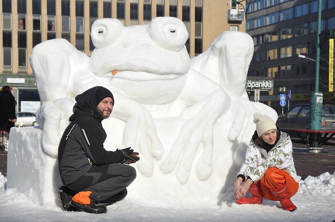 Tapahtumassa mukana olleet T.E.H.D.A.S. Ry:n taiteilijat Antti Pedrozo ja Iida Nikitin veistivät päivän aikana vaikuttavan kokoisen sammakon lumesta. Toisen valmiiksi tehdyn lumikuution veistoon ryhtyi Maan ystävien pitkäaikainen aktiivi Tapio Solala. Lasten veistoksista ja muovailuista syntyi lumiukkojen ja -akkojen lisäksi monenlaisia eläimiä sekä lumilinna ja tietysti liukumäki.