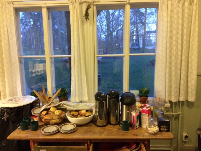 Lauantaina ehdin itse paikalle vasta piirikeskustelun loppuun, mutta ajoitus oli mainio lounaan kannalta. Väentapaamiseen oli palkattu kokki laittamaan vegaanista ruokaa ja hän loihti pöytään mm. maukasta borssikeittoa. Jäljelle jääneen keiton hän leipoi mukaan herkullisiin leipälimppuihin.