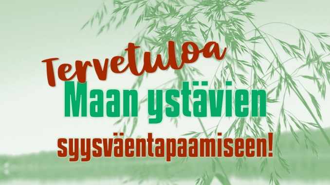 Maan ystävien valtakunnallinen väentapaaminen järjestetään viikonloppuna 4.-6.11.2022. Luvassa on mielenkiintoisia puheenaiheita, vegaanista ruokaa ja mukavaa yhdessäoloa. Kaikki Maan ystävien toiminnasta kiinnostuneet ovat lämpimästi tervetulleita mukaan!
