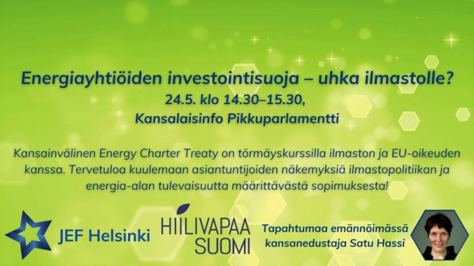 Tapahtumassa asiantuntijat kertovat ECT-sopimuksen loppusuoralla olevista uudistamisneuvotteluista sekä sopimuksen ristiriidoista suhteessa ilmastotoimiin ja EU-oikeuteen.