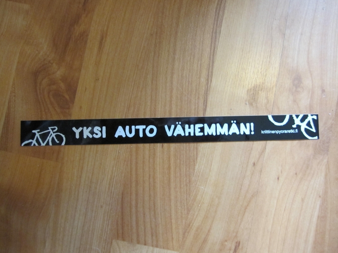 MY on toiminut yli kahden vuosikymmenen ajan oikeudenmukaisemman, kestävämmän ja onnellisemman maailman puolesta. Jäsenenä autat toimimaan tästäkin eteenpäin ympäristönsuojelun, ihmisoikeuksien, sosiaalisen oikeudenmukaisuuden, kehityskysymysten, sekä rauhan ja demokratian edistämiseksi. Kun liityt jäseneksi nyt, saat lahjaksi nokkelan Yksi auto vähemmän -tarran polkupyöräsi koristeeksi. Tarra on valittavissa kuudella eri kielellä: englanti, suomi, ruotsi, espanja, ranska, saksa. Tarrapohja on musta ja teksti valkoinen. Tarra on säänkestävä. Lahjan saa liittyessään 31.3.2018 mennessä. Tuotteella ei ole vaihto- eikä palautusoikeutta.