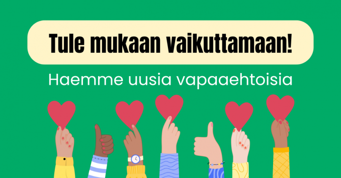 Tule tekemään monipuolisia viestinnän tehtäviä yhteistyössä muiden vapaaehtoisten kanssa. Pääset myös tekemään tärkeää vaikuttamistyötä ja saat kokemusta eri viestintäkanavien ylläpidosta, some-viestinnästä, uutiskirjeiden koostamisesta ja nettisivujen päivittämisestä.